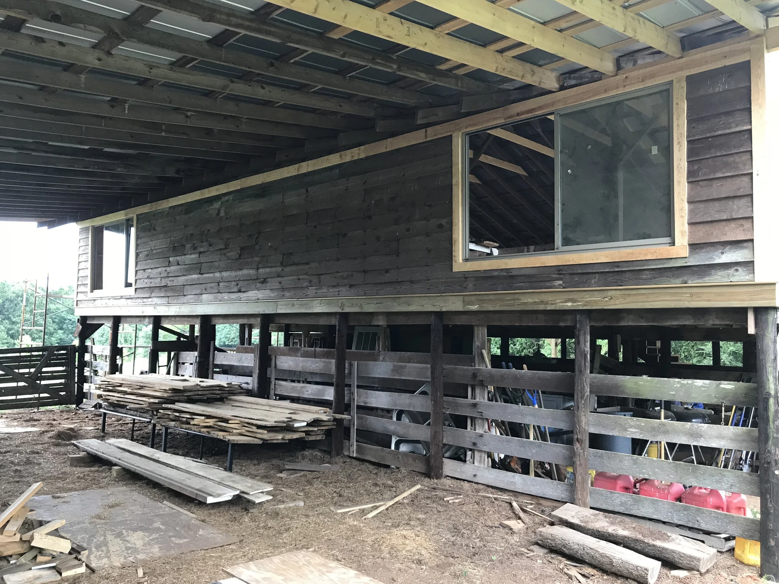 On the property was an old, beautiful barn in shambles. The roof was caved in, the floors were crumbling and it posed a safety hazard for our family with young boys running around the farm. Instead of tearing it down, we envisioned renovating it as the central hub for community on the farm. In 2017 we began the process, carefully selecting trees from the land and milling them to be used for the barn. All the siding (in addition to other elements of the barn) is from trees grown on our property.